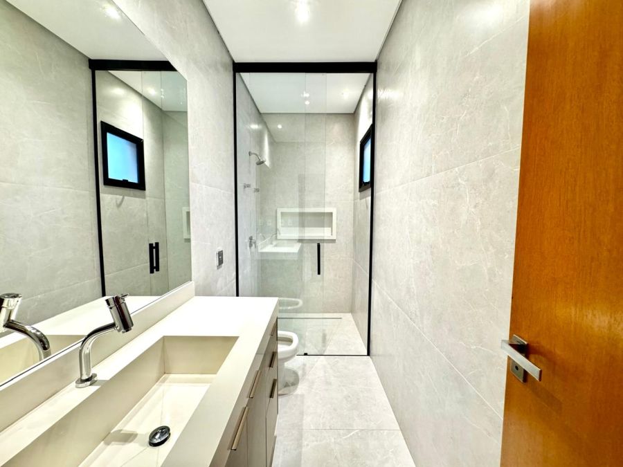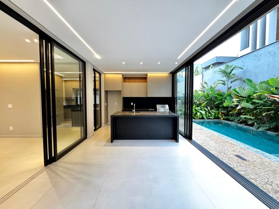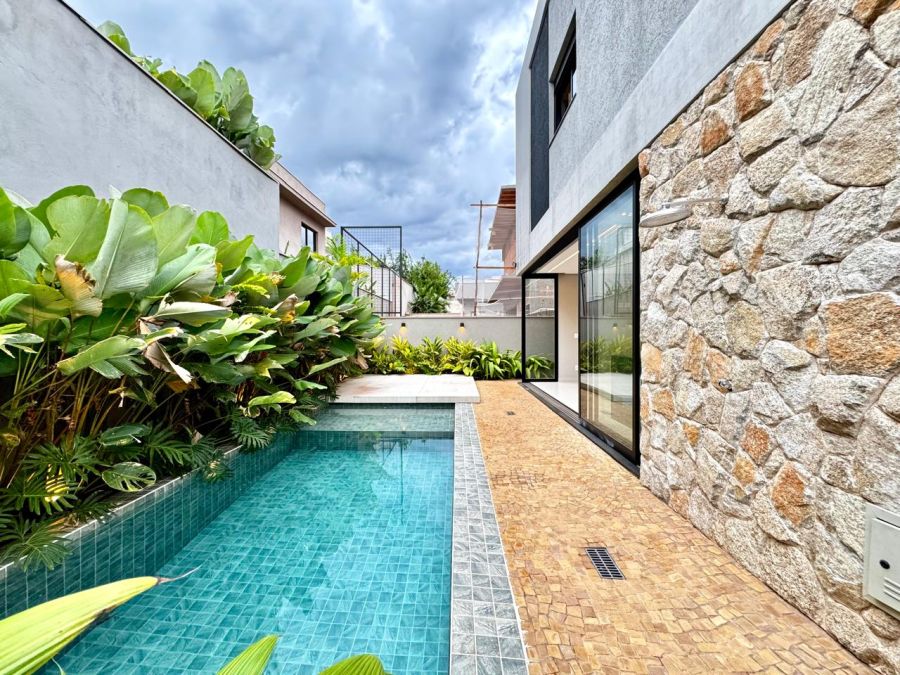 No piso térreo, o imóvel oferece home cinema separado, cozinha independente com ilha central e despensa, área de serviço bem posicionada, lavabo e uma varanda gourmet convidativa, equipada com churrasqueira e integrada à área de lazer. A piscina com prainha e hidromassagem, acompanhada de vestiário, transforma o espaço externo em um verdadeiro refúgio particular para momentos de descanso e convivência.